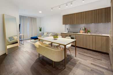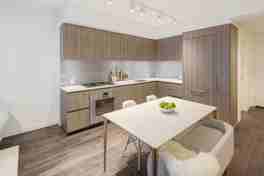 Welcome to One Mission Bay Park 422. This spacious chic 1 bd +den floor plan melds fine contemporary finishes with quiet courtyard views to create a serene escape from the busy city . Hardwood paves the floors throughout the home, and multiple custom closets provide ample storage. In the handsome L-shaped kitchen, modern cabinetry and Caesarstone countertops surround high-end Gaggenau appliances. Central heat and air conditioning ensure year-round comfort, in-unit laundry provides the ultimate city convenience, and 1 car parking is available for lease on site.