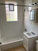 Updated Bathroom — Clean and bright with white ceramic tile, a full tub/shower combo, modern fixtures, and a stylish glass block window for privacy and diffused natural light.