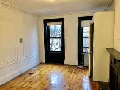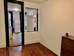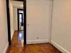 The kitchen has a window, space for a breakfast table, The extra room between the kitchen area and the bedroom is perfect for an office, or guest room. The bedroom is ample and can easily fit a king-sized bed with extra furniture. Exposed brick and recessed lighting add to the charm of the unique layout of this floor-through apartment.