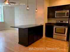 The kitchen features granite counters, modern cabinetry, dishwasher, built-in microwave and breakfast bar for casual dining. High ceilings and open concept between the kitchen and living area is great for entertaining! The living area has gleaming hardwood floors and large windows to let in tons of natural light.