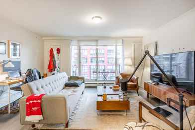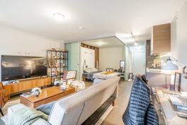 Fantastic Chinatown 1 bedroom with flexible glass sliding walls! The suite offers modern finishes with built-in cabinets, dishwasher and fridge. Appliances are stainless steel with stone countertops. The bathroom is large with a soaker tub, and lots of under the sink storage. The unit also includes a Wall Bed. On either side of the Wall Bed, there are two built-in wardrobes. There is also in-unit storage.