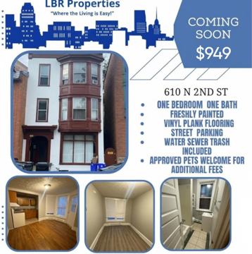 One bedroom Apartment Downtown Harrisburg Coming Soon. This first-floor apartment has a private off street entrance, new paint vinyl plank flooring the apartment is within walking distance to Restaurant Row, Front Street walking trail and mid-town restaurants & attractions. Tenant is responsible for electric. Street parking. Access to coin op laundry L available nearby. $949 SECURITY DEPOSIT! $25 APPLICATION FEE ! Application requirements - 550 credit score, 2.5x income, good landlord reference. Anyone 18+ must apply separately. *Unpaid eviction(s) and/or judgement may disqualify the application. An approved application must be on file in order to schedule a showing! For serious inquiries, please complete an application online at: https lbr-properties com Feel free to call us with any questions 717-512-0065 Lease Terms 12 or 18 months Street Parking Nearby Coin-Op Laundry Electric Stove, Electric Heating 1st Floor
