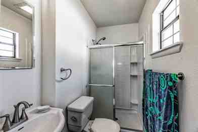 3 bedroom 2 bath, the living room has wood floors and woodburning brick fireplace. 2 guest bedrooms to the left with full guest bath. Each guest room has wood floors, ceiling fans, and step-in closets. Right side off living room enters into dining area with wood laminate floors, solid surface kitchen countertops, breakfast bar, recessed doublesink, newer fixtures, Off dining, is master bedroom with walk-in closet and en-suite 3/4 bath. Off kitchen, is the utility room with washer/dryer and pantry that leads to back yard. Concrete porch with grassy area transitioning into xeriscape.