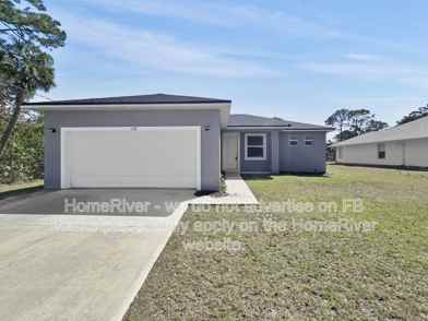 This beautiful 2022-built home at 1138 Westunder St SE, Palm Bay, FL 32909, offers a perfect blend of modern comfort and functional design featuring a pet-friendly, open-concept layout with fresh paint and vinyl flooring throughout. The high ceilings and split bedroom floor plan create a light and airy atmosphere, highlighted by a kitchen equipped with stainless steel appliances, white wood cabinetry, granite countertops, and a convenient breakfast bar. Practicality meets style with a laundry room located off the kitchen providing internal access to the two-car garage, while the master suite boasts a walk-in shower and a dual-sink vanity. Residents can enjoy a serene lifestyle with a large backyard overlooking a peaceful canal, all while benefiting from the home's dedicated water treatment system.