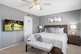 Comfortably furnished townhouse conveniently located close to Old Town Scottsdale in quiet community. Great two-story two-bedroom layout. Both bedrooms are upstairs. U-shaped kitchen with breakfast bar and eat-in area that opens to the covered patio. Contains everything needed (kitchen, bed, etc... essentials). Separate inside laundry room includes washer and dryer. Assigned covered parking. Community swimming pool with pool towels in-unit. Easy to use YouTube TV with all streaming apps. Walking distance to Valley Ho Hotel, Old Town Scottsdale, and Scottsdale Stadium. 5-minute Uber ride to The W Hotel. Great location for access to airport, TPC, ASU, and freeways to other surrounding metro areas. Weekly Rates Available