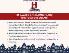 HomeRiver Group does not advertise properties on Facebook MarketPlace,, LetGo, or other classified ad websites. If you suspect one of our properties has been fraudulently listed on these platforms, please notify HomeRiver Group immediately. All payments related to leasing with HomeRiver Group are made exclusively through our website. We never accept wire transfers or payments via Zelle, PayPal, or Cash App. Lease your home safely through www Homeriver com or with the assistance of a licensed HomeRiver Group leasing agent. All leasing information contained herein is deemed accurate but not guaranteed. Please note that changes may have occurred since the photographs were taken. Square footage is estimated.