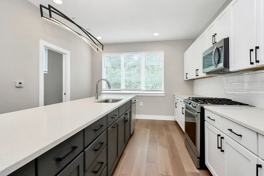 The second level features a spacious living area filled with natural light, high-end LVP flooring, and an open connection to the dining area and kitchen. The kitchen is outfitted with stainless steel appliances, a gas stove, quartz countertops, and a large island, along with clean modern finishes. A convenient half bathroom is also located on this level.
