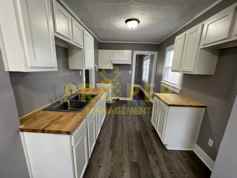 nice 3 bedrooms 1 bathroom house , covered fromt porch , 1 car garage , washer and dryer hookups in the basement , new kitchen cabinets , large living room and dining room .