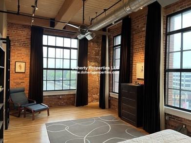 This stunning top-floor one bedroom loft in Downtown Lowell blends historic charm with modern finishes. Featuring soaring 14-foot timber-beamed ceilings, exposed brick, and a full wall of oversized windows, the space is flooded with natural light and offers impressive views of the city and canal. The open-concept layout includes a beautifully designed kitchen with custom cabinetry, granite countertops, and stainless steel appliances, all flowing into a spacious living area with gleaming hardwood floors. Unique architectural details, including a stained-glass accent, add character throughout. Enjoy 1.5 bathrooms, in-unit laundry, and one off-street parking space. Conveniently located near the Lowell commuter rail, shops, restaurants, and the Riverwalk, urban living at its finest.