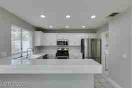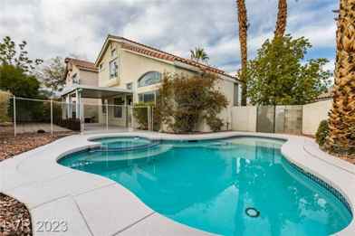 Welcome to this stunning two-story, three-bedroom, 2.5-bathroom home in the heart of Summerlin! The spacious living room flows seamlessly into the dining area and open kitchen, featuring a breakfast bar, tile countertops, a pantry, and stainless steel appliances—plus plenty of cabinet and counter space. Upstairs, the primary suite boasts a walk-in closet and double sinks. Outside, enjoy a beautifully maintained backyard with a sparkling pool, relaxing spa, and lush landscaping. With tile and wood flooring throughout and numerous upgrades, this home is move-in ready and waiting for you!