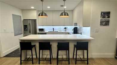 East of US1, within walking distance of the Hollywood Lakes, Hollywood Broadwalk and two golf courses. 2 bedroom, 2 bathroom unit on the second floor. This unit comes furnished. Fully updated in 2019, where owners spared no detail. Wide plank white oak engineered hardwood throughout. Kitchen adorned with black onyx matte tiles. Modern bathrooms. Nest Smart Thermostat and August Lock. Unique bar/coffee bar area. Central A/C from 2020. Tankless water heater from 2021. Plenty of closets and storage. One assigned parking space and guest parking available. Rental includes water, sewer, trash and cable. Community has a large pool, bocce court and lounge deck. 55+ community where at least one tenant must be over 55. No pets, per the building. HOA approval required. Very easy to show. Owner is agent. Primary bedroom has a king bed. Second bedroom has a queen bed. Each bedroom has its own ensuite.