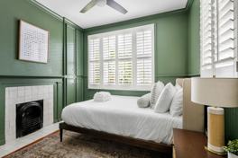 Enter through the side door into the foyer. To the right is the elegant dining room which faces Wentworth Street and features a dining table with seating for four people. This light filled room is also a great space to spread out at the table and work from home! To the left is the stunning living room. Here you will find a comfortable seating arrangement with a sofa, chair, and coffee table, beautiful decorative fireplace, Smart TV, and an adorable bar area with a wine fridge! Just beyond the living room is the updated kitchen. The gray cabinets, green backsplash, and French doors to the patio give this space a serene feel. There is a gorgeous kitchen island with marble countertop and seating for two, stainless steel appliances, and plenty of cabinet space. The washer/dryer are also located in the kitchen for your convenience! Open the French doors and bring your entertaining or dining al fresco! The private patio features beautiful landscaping, string lights, and a dining table for four!