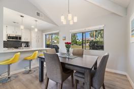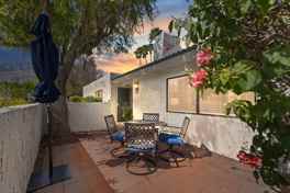 Experience stunning mountain views at sunset from the front and back patios and the Living Room. This 3BR/2BA villa-style condo, with no shared living-space walls, was refreshed to reflect the modern Palm Springs' vibe. It is nestled in Sunshine Villas, a gated and small (120 units) community. Just outside the tennis and pickle ball courts is the Prescott Preserve, a lush nature retreat. Sunshine Villas has begun a landscaping retrofit with drought-resistant desert plantings. There are 4 pools and hot tubs, with one set only feet from the unit. HOA dues include water, garbage, Spectrum cable and Internet, maintenance, landscaping, and desert scape upgrade project. Dog Park. Close to downtown - near Sunrise Park, shopping and restaurants. Offered turnkey furnished with all that you see in the photos plus dishes, etc., and everything needed for easy Palm Springs' living. Cable, high speed internet, water and trash are included (tenant pays gas and electric). Dog friendly. Available for 8 month lease through November 2026.