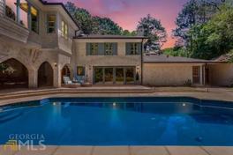 This house is spectacular and very private! Four bedrooms three full bathrooms upstairs and two half bathrooms downstairs makes this the perfect house for large groups. The master suite is nothing short of stunning! It over looks the pool and jacuzzi. has its own private balcony. There is a par 3 golf course across the street and Bobby Jones golf course 2.5 miles away. The property is bordered to the W and S by Peachtree Creek. There is a large covered outdoor porch with a fire place.