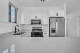Quartz kitchen counter tops & stainless still appliances. Porcelain floors downstairs & laminate/wood floors upstairs.