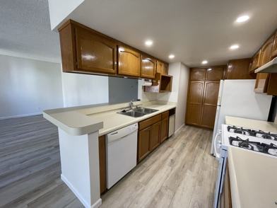 Fantastic condo in a great neighborhood! This is top-floor unit and is nice and bright 2 bedroom, 2 bath condo with an open floor plan. There is new paint and new vinyl plank flooring throughout, and a fireplace in the large living room with lots of windows. and a bar open to the kitchen plus a dining area! The kitchen has lots of counter space and cupboards with lots of new led recessed lights. The bedrooms are large with lots of closet space. The primary bedroom has an attached bathroom, an extra large closet, and a door to a private balcony. The 2nd bedroom is nice and bright. There is a full-size washer and dryer in the unit. The condo also features a 2 car tandem garage! Close to shopping, easy access to freeways. Available now.