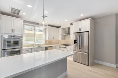The beautiful kitchen comes with stainless steel appliances, French door refrigerator, quartz countertops, double oven, modern tiled backsplash, designer faucets, attached island, and walk-in pantry.
