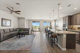 WICKENBURG RANCH. Beautifully furnished with a serene vibe welcome you to this newly built 2 bed, 2.5 bath, with Den and spacious 2-car garage. Room darkening shades are installed in the bedrooms. The well-appointed kitchen features wall ovens/microwave/convection oven combo. The HOA takes care of the landscaping. Enjoy some time on the patio with wonderful views to the south and Vulture Peak. Available 6/15/2025.