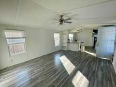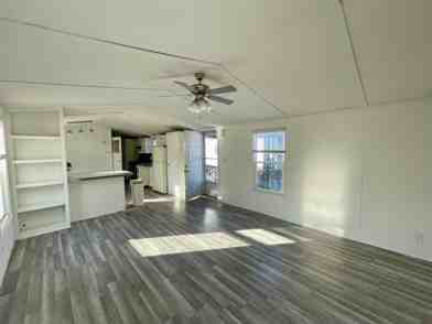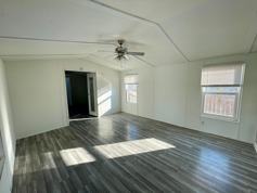 This two-bedroom, two-bathroom manufactured home features a handicap-accessible ramp and a small front porch leading into an open, modern floor plan. The kitchen features gas stove cooking, lots of counter & cabinet space, island counter/dining top, and a designated dining room area. Two bathrooms offer one with a walk-in shower and the other with a tub.