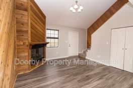This inviting duplex offers comfortable living with character, located at 3612 Glendon Dr – B in Chattanooga. The main level opens into a living room with a fireplace and wood accent wall, flowing into a dining area and galley-style kitchen equipped with a range, refrigerator, microwave, and dishwasher.