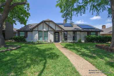 Welcome to this beautifully updated home at 1409 Creekside Dr, Richardson, TX 75081. Nestled in a serene neighborhood, this residence boasts a charming exterior with classic Tudor-style accents and energy-efficient solar panels. As you step inside, you're greeted by a spacious entryway leading to the main living area, which features vaulted ceilings and a cozy fireplace, perfect for relaxing evenings. The open floor plan seamlessly connects to the dining area, which is bathed in natural light from large windows that offer a picturesque view of the lush front yard.