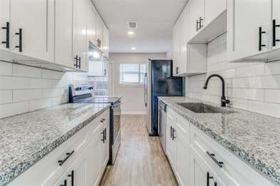 Welcome to your beautifully updated 3-bedroom, 2-bathroom home offering modern comfort and convenience. Step inside to discover stylish vinyl flooring throughout, providing both durability and easy maintenance. The kitchen is a chef’s dream, featuring sleek granite countertops, crisp white cabinets, and a full suite of stainless steel and black appliances.