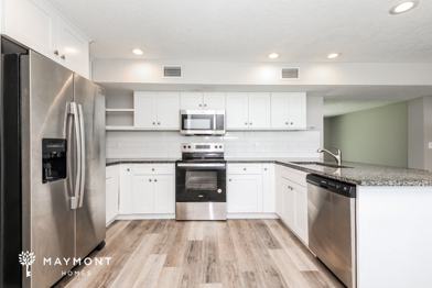 Step inside to a refreshed kitchen featuring sleek white cabinets, granite countertops, a subway tile backsplash, and stainless-steel appliances. Wide-plank, neutral-toned flooring runs through the main living areas, adding warmth and cohesion to the design.