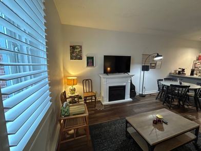 1 BR 1 BA condominium with exposed brick. Located in downtown 99 block area and offers easy access to entertainment, coffee shops, restaurants and musical venues. Quiet location on the 4th floor overlooking a courtyard. A raised furnished patio with grills is also available to residents. Includes parking in secure parking garage attached to building. Great neighbors and parking spot!
