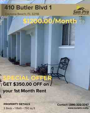 Special: Get $350 Off on your 1st Month Rent. Now available in Daytona. Discover this spacious 2-bedroom, 1-bath home featuring tile flooring throughout for easy maintenance and a clean, modern look. The open living and dining area flows into a functional kitchen with ample cabinet space and natural light. Sliding glass doors open to a private patio area, perfect for enjoying the outdoors. Conveniently located near shopping, dining and just minutes from the beach. $75 nonrefundable Application Fee per adult. One month's rent security deposit, $150 administrative fee and first month's rent required prior to move-in. All Sun-Pro Realty and Management residents are enrolled in the Resident Benefits Package (rbp) for an additional $50 per month which includes renters insurance, HVAC air filter delivery (for applicable properties), credit building to help boost your credit score with timely rent payments, $1M Identity Protection, move-in concierge service making utility connection and home service setup a breeze during your move-in, our best-in-class resident rewards program and much more. More details upon application. Pet Friendly, Water, Garbage, Sewage, Concierge, Patio & Tile. Provided by rentalsource com