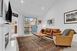 The kitchen has convenient a breakfast bar and comes equipped with a full suite of appliances - refrigerator, oven, dishwasher, and microwave are all included. The generous living room has a gas fireplace and access to the back deck. A cozy den is located at the back of the home, perfect for a home office. Two large bedrooms and two baths complete the home, with in-unit laundry located in the hall closet. There is one garage spot with plenty of storage as well as a reserved exterior parking space.