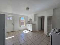 Discover the effortless charm of Southwestern living in this quintessential 700-square-foot adobe-style home. The interior welcomes you with an expansive, open-concept layout defined by crisp white walls and neutral tile flooring that flows seamlessly through every room. A bright kitchen offers ample cabinetry and counter space, transitioning naturally into a versatile living area illuminated by deep-set windows. The bathroom blends vintage character with modern updates, featuring a classic wall-mounted sink alongside a clean shower-tub enclosure.