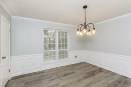 The entry leads into bright formal spaces, beginning with the dining room, where large windows frame the front yard and wainscoting adds classic detail. From here, the layout flows into a spacious living room highlighted by a brick hearth, multiple windows, and crisp new wall finishes. Durable flooring carries throughout the main level, tying each space together. The kitchen sits nearby, offering warm wood cabinetry, extensive counter space, stainless-steel appliances, including the new refrigerator, and a layout suited for both cooking and gathering.