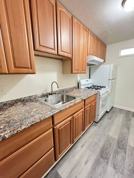 Kitchen features ample counter space and cabinets, gas range, and full sized fridge.