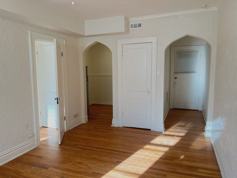 This 500 sq ft apartment features hardwood floors, large windows, and a kitchen with a fridge, gas range, dishwasher, and generous cabinet space.