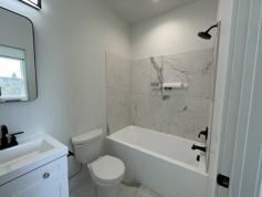 This one bedroom suite averages about 350 square feet and includes a full-size fridge, sink, microwave, and stone countertops, along with a tile-finished en suite bath with tub and shower. The common area provides a full-size kitchen, along with shared washer and dryer facilities.