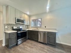 - Recently renovated kitchen featuring stainless steel appliances and a stylish movable island on wheels for extra counter space and flexibility