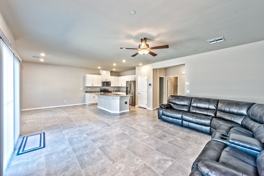 Stunning 6-bedroom, 3-bath home featuring a spacious open-concept floor plan with high-end porcelain tile throughout the main living areas and upgraded plush carpet in all bedrooms. The gourmet kitchen is a showstopper, offering a large island with under-mount stainless steel sink, breakfast bar seating, premium appliances, upgraded cabinetry, and a generous pantry—perfect for both everyday living and entertaining. A full bedroom and bathroom are conveniently located downstairs, ideal for guests or multigenerational living. Upstairs, you’ll find spacious secondary bedrooms and a luxurious primary suite with a spa-inspired bath featuring dual sinks, granite countertops, and an oversized walk-in shower. This home is loaded with upgrades including designer light fixtures, ceiling fans, and shutters throughout. Enjoy modern living with smart home automation, security system, Ring doorbell, EV-ready 1450 NEMA charger, RO alkaline drinking water system, and whole-house water softener.