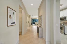 Step into comfort and luxury in this newly remodeled first-floor coach style home. This 2 bedroom plus den, 2 full bath property boasts upgraded lighting, high end furnishings, tile throughout and new laminate wood flooring in the bedrooms. The kitchen features upgraded cabinets, Bosch appliances, a dining area and high top bar seating. Enjoy impeccable details such as crown molding, recessed lighting, a screened front door, tiled lanai, and built-in shelving/cabinets in the den. Highlighting this property is its first-floor location, screened lanai overlooking the golf course and delightful southern exposure. The den can serve as a flexible space, spacious enough for formal dining, a media room, or an exercise space. As a bonus, this unit includes a fee-based transferable golf membership as well as convenient access to the community pool and spa. The clubhouse offers additional amenities such as a formal dining option, game/meeting rooms, fitness center, resort-style pool/spa and a tennis facility. The location is great, with easy access to beaches, shopping, dining and RSW Airport. Vasari is a gated golf community offering golf, bocce, tennis to swimming in the resort style heated pool and walking paths throughout.