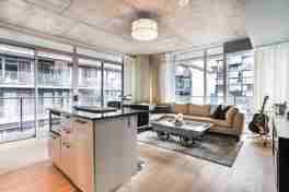 Fully furnished and available immediately in the heart of king west! Over 700 sq ft modern, spacious corner unit w/exposed concrete ceilings, hardwood floors throughout & wrap around sun filled floor to ceiling windows. Master suite w/large closets, custom organizers & 4pcs semi- ensuite. 300 sq ft large wrap around terrace w/gas line for bbq. Parking, locker, internet and all furnishings including kitchen supplies included. 1000 sq ft of total living space
