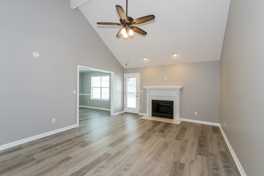 Step inside to discover a bright, open living area featuring fresh interior paint, LVP flooring, and vaulted ceilings that add volume and light. A white-framed focal point anchors the living room, the perfect centerpiece for cozy evenings or relaxed gatherings.