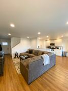 This home features a 2-car garage, stainless steel appliances, quartz countertops in the kitchen and bathrooms, and durable vinyl flooring throughout. A wall-mounted heating and cooling unit serves the main floor, with a washer and dryer conveniently located upstairs.