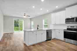 One of the highlights of this home is the large, chef-ready kitchen, which serves as the central hub of the house. It is equipped with high-quality stainless-steel Whirlpool appliances, including a refrigerator with an ice maker, ensuring that all your culinary needs are met. The kitchen also boasts spacious quartz countertops, providing ample workspace, and 42'' upper-wood cabinets with crown molding, adding a touch of elegance and sophistication.