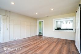 Step inside to an inviting living area where wood-look LVP flooring runs throughout the main spaces, creating warmth and durability in equal measure. Large windows allow natural light to pour in, while built-in shelving adds character and practical display space. A sliding barn-style door introduces a touch of architectural interest and separates spaces with style and function.