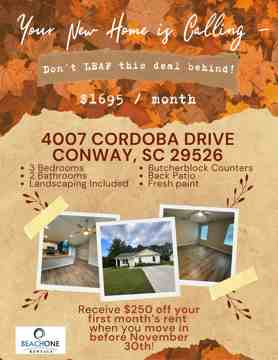 Welcome to this charming 3-bedroom, 2-bathroom home located in the desirable area of Conway, SC. This beautiful unit offers a comfortable and inviting living space for you to call home. With three spacious bedrooms, there is plenty of room for everyone to have their own private retreat. The two bathrooms provide convenience and functionality for your everyday needs. The open floor plan allows for seamless flow between the living room, dining area, and kitchen, making it perfect for entertaining guests or spending quality time with loved ones. The kitchen is equipped with essential appliances, providing you with the tools you need to create delicious meals. The house is situated in a convenient location, offering easy access to nearby amenities such as shopping centers, restaurants, and parks. Whether you're looking to relax in the comfort of your own home or explore the surrounding area, this house provides the perfect opportunity to do so. Don't miss out on the chance to make this house your own and create lasting memories. Sorry, no pets allowed. Landscaping included. Tenant responsible for all utilities and renters insurance. Annual lease required. Resident Benefits Package (RBP) Available!