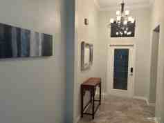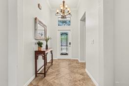 A screened-in pool and expansive open living areas define this 4-bedroom, 3-bath home, offering a layout that balances indoor comfort with outdoor enjoyment. Tile flooring, crown molding, and a ceiling fan enhance the main living space, where natural light filters through well-placed windows. The adjacent dining area sits beneath a modern chandelier, creating a refined yet connected setting for everyday meals and gatherings.