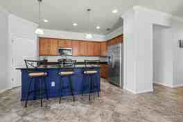 The kitchen is anchored by extensive cabinetry, ample counter space, and a central island with bar seating. Included appliances - refrigerator, dishwasher, and microwave - add practicality, while stainless steel finishes and pendant lighting contribute to a polished, functional workspace. Its direct connection to the main living area keeps everything within reach.