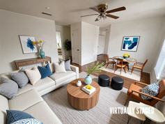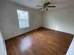 2 bedroom 1 bathroom downstairs unit with washer and dryer connections. Features laminate flooring, ceiling fans, and a cozy living area. The kitchen offers space for dining, and both bedrooms are carpeted for added comfort.