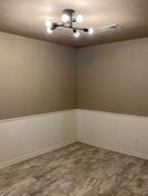The dining area features a beautiful new light fixture and has plenty of room for gathering.