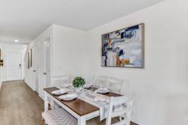 Pearson A is a two-story townhome featuring 3 bedrooms and 2.5 bathrooms. On the right side of the foyer is a half-bathroom for first floor convenience. Further down the hallway leads to an open concept kitchen, dining room and living room area perfect for entertaining guests. The standard rear covered patio is located off the living room. Bedroom 1 features dual vanities and a spacious walk-in closet. Bedrooms 2 and 3 are situated across from the stairs and share bathroom 2. The laundry room with washer and dryer included are centrally located on the second floor between all the bedrooms.