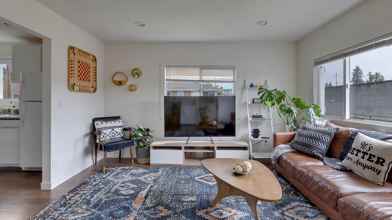 This spacious 4 bed, 2 bath North Tabor duplex is full of charm with a two-level interior, hardwood floors, and tall ceilings for a light and airy feel. The bright kitchen boasts granite countertops, abundant counter space, a dishwasher, under sink water filter, and great natural light from the big window above the sink. Fully furnished with a boho mid-century vibe and all the comforts of home. The floor plan features one bed and one bath on the first level, with two additional bedrooms and a bathroom upstairs. Also upstairs, a modern barn door slides open to reveal a unique bonus room for working from home, and there’s an extra storage area too. This pet-friendly NE Portland duplex also has a large, fenced front yard for excellent outdoor entertaining options and an in-unit washer/dryer. Other convenient perks include a smart Nest thermostat and Ring video doorbell. Note: This property has a second apartment in the basement with its own entrance. From this spot in the vibrant North Tabor neighborhood, you’ll be close to I-84, Laurelhurst, Montavilla, the Hollywood District, and more. It’s a nine-minute walk to the MAX Blue, Green, and Red lines at the NE 60th Ave MAX Station stop. Plus, the 19 and 20 bus lines are within a block or two. This location has fantastic access to everything that makes Portland great—restaurants, bars, parks, and more. The year-round Montavilla Farmers Market is within 1.5 miles, and beautiful Mt. Tabor Park is just a bit further. Trader Joe’s, QFC, Fred Meyer, and more are within a quick drive. In the morning, walk a couple of blocks to Seven Virtues Coffee Roasters for a latte. Plus, there are fantastic dining options within two miles, including Screen Door Eastside, The Observatory, Malka, Crema Coffee + Bakery, Coquine, and Vintage Cocktail Lounge.